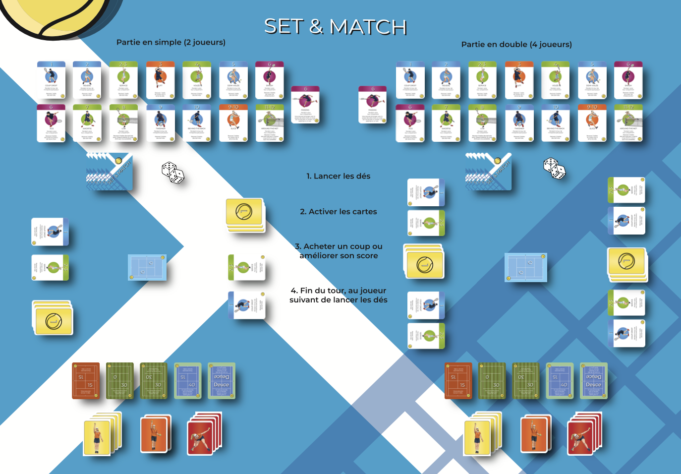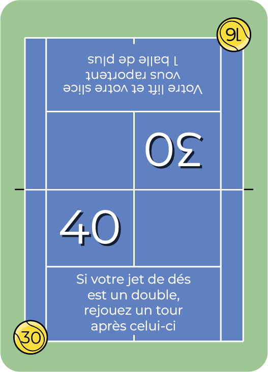 Chaque joueur commence la partie avec une carte coup droit et une carte service et 3 balles. Chacun leur tour, un joueur lance un ou deux dés. Le score des dés active les cartes des joueurs. Les cartes font gagner ou perdre des balles aux joueurs. À la fin de son tour un joueur peut dépenser ses balles pour acquérir une nouvelle carte coup ou améliorer son score. Retrouvez toutes les règles ici (https://setetmat.ch/les-regles/).
